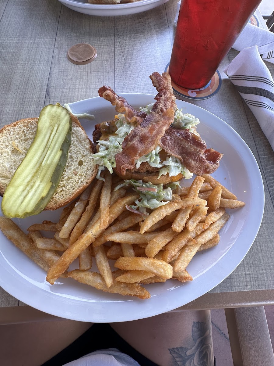 This is a very inexpensive good meal. The Fried Zucchini is absolutely mouthwatering It was light and crispy the ranch was very good. The portions here are also very good. I ordered the grilled chicken sandwich and was disappointed the chicken looked good but was dry and tough. The hostess we're all attentive and Friendly. Good came out within 5 minutes. I would recommend I will try something different next time since chicken was dry on this sandwich.